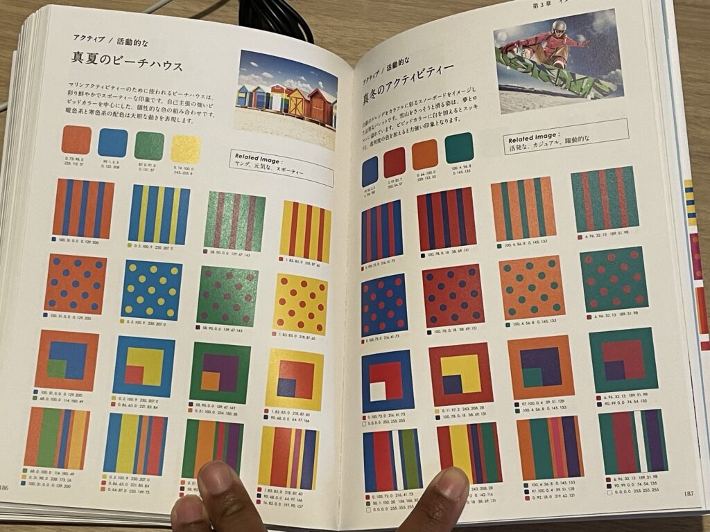 The title translates to: Perfect Color Coordination and Combination Reference Book. It has over 3400 color combinations of 2, 3, and 4 colors! Some pages even have 8 color combinations!