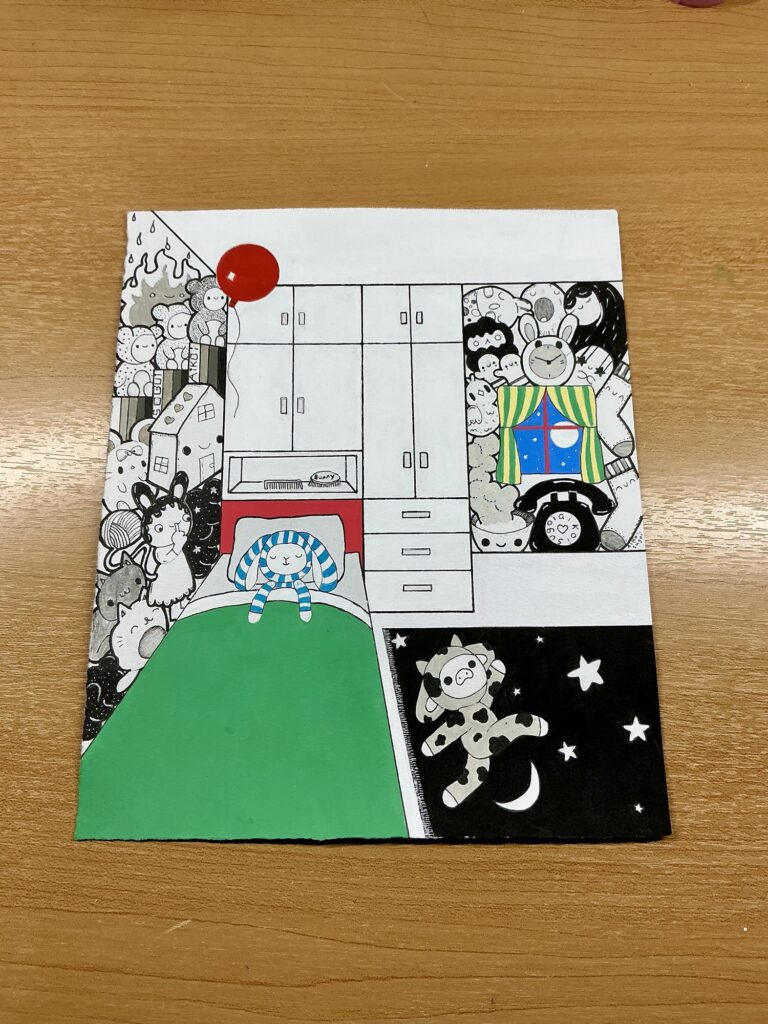 In my last post I mentioned how I wanted to try an idea I had given up on after my first attempt. The idea? Themed doodles! And here is attempt #2, a themed doodle of the classic children’s book Goodnight Moon. My first themed attempt was based of the movie Wicked. I’m too lazy to track down the post but you can find it in my 2025 posts. Unlike my first attempt, in which I tried to stay faithful to every detail in the wizard of oz story, I was a lot little looser in my production of Goodnight Moon, choosing instead to stick to key elements of the story like the red balloon and the cow jumping over the moon.