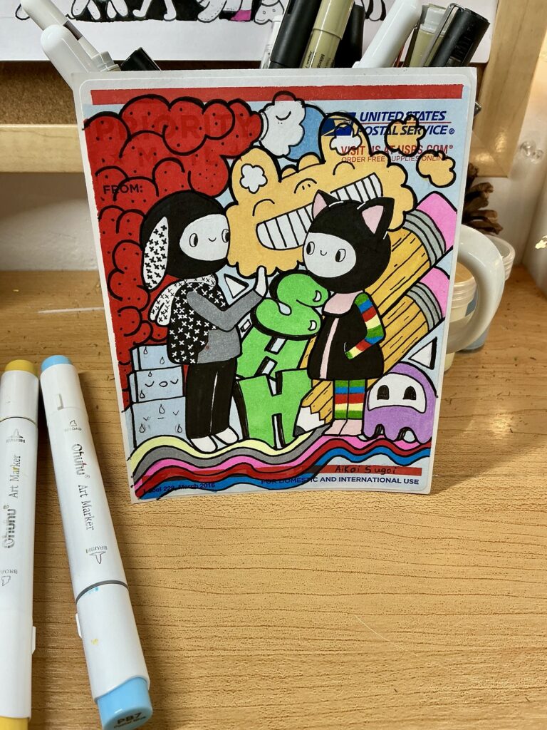 As you can see this is not a mini doodle. It’s what’s known as a sticker slap and has a long history in the world of graffiti. Until I started doing art, I didn’t know what a sticker slap was. I had seen them stuck to mailboxes and utility poles and admired how cool they looked but wasn’t aware of their significance. I simply wondered why people were drawing on mailing labels and sticking them everywhere? Once I learned more about the history of the label in street art I was interested in making a sticker slap of my own for fun,